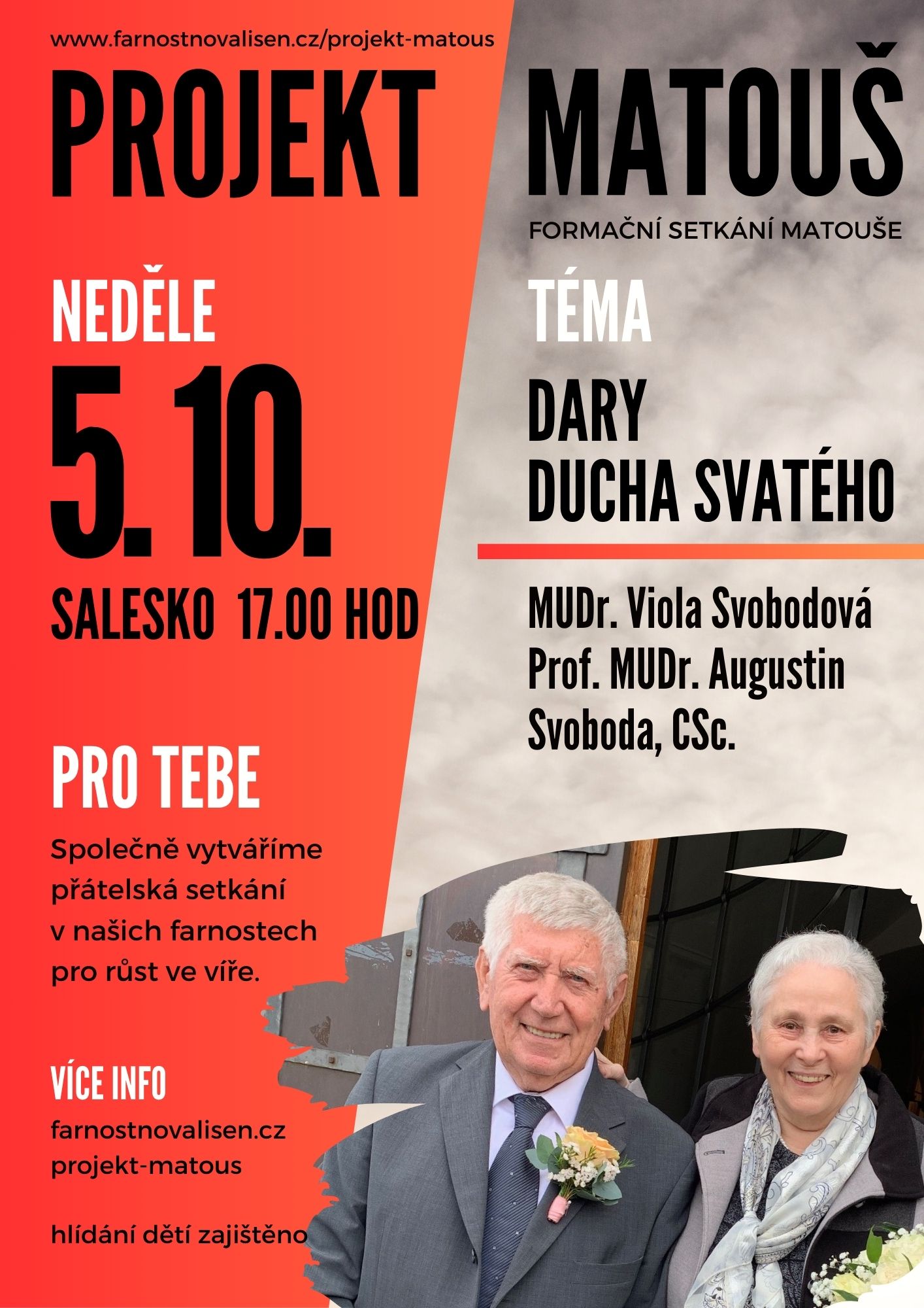 • Dnes odpoledne v 15 hodin vás zveme na růžencovou pobožnost na Kostelíčku a od 17 hodin do Saleska na setkání Projektu Matouš. Hlavní téma tohoto setkání budou "Dary Ducha svatého". Společný čas u kávy, modlitba a vyučování od manželů Augustina a Violy Svobodových. O děti bude postaráno. Začátek v 17 hodin.