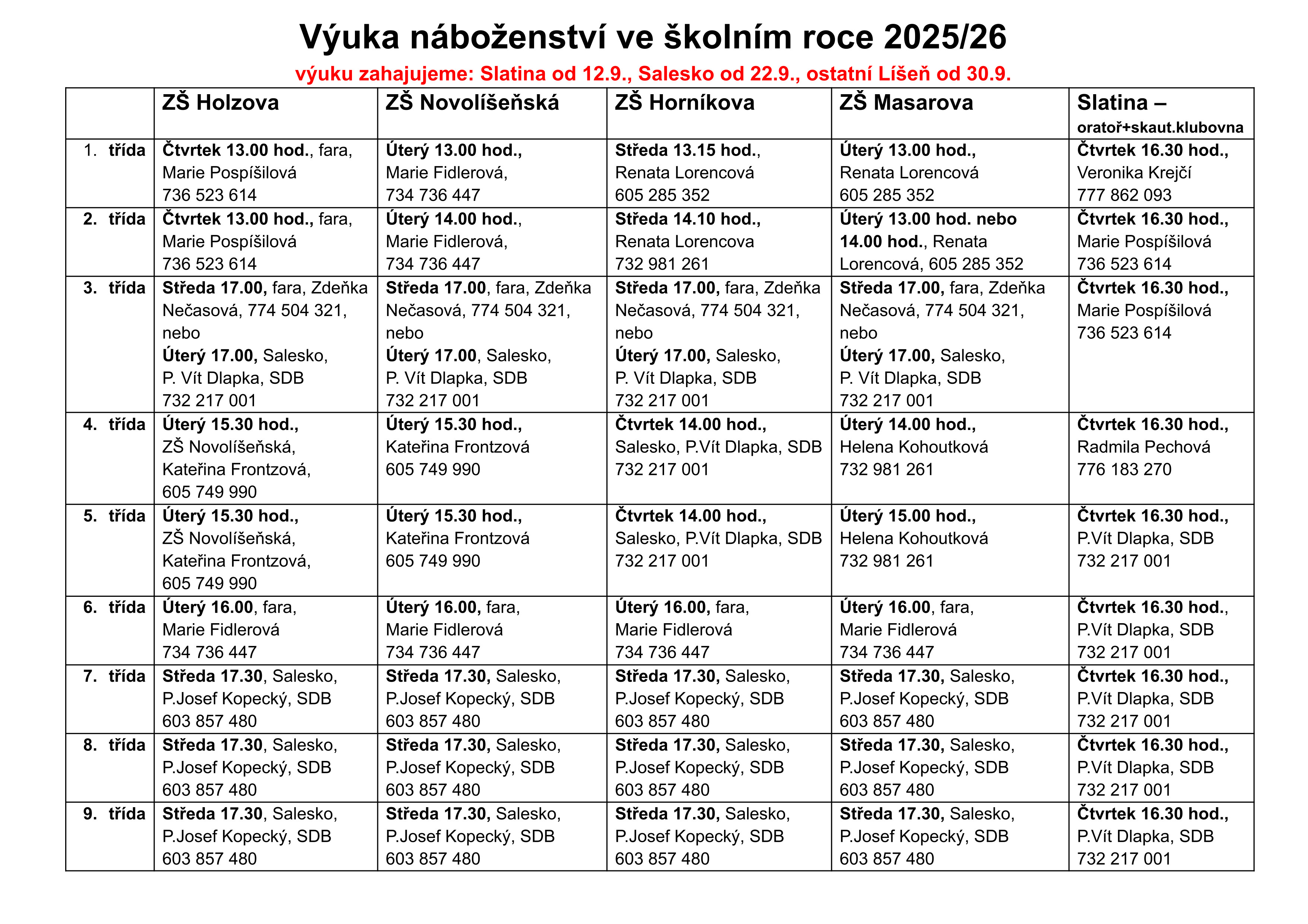 • Přihlášky do náboženství je možné získat na webu farnosti a vyplněné odevzdat do schránky na faře nebo v Salesku. Výuka náboženství začne od 22.9. v Salesku, ostatní školy i na faře od 30.9.